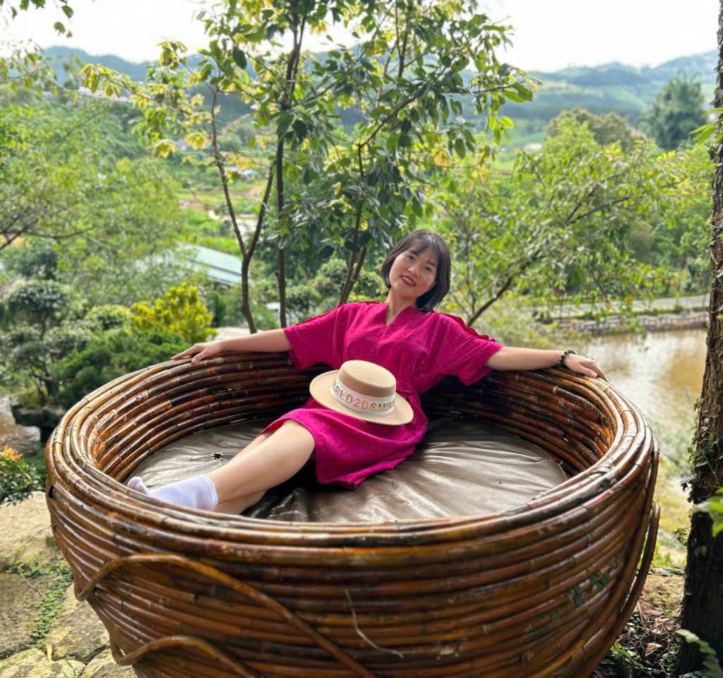Trong một bức ảnh, cô ngồi giữa thiên nhiên, tựa lưng vào ghế tre tròn, tay đặt nhẹ trên vành mũ. Không sân khấu, không micro, không ánh đèn.